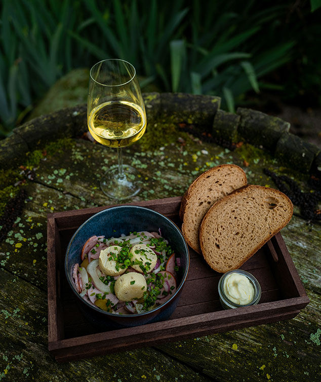 eingelegter Handkäse | Bauernbrot | etwas Musik | gesalzene Butter | Kräuter